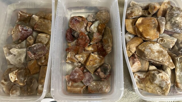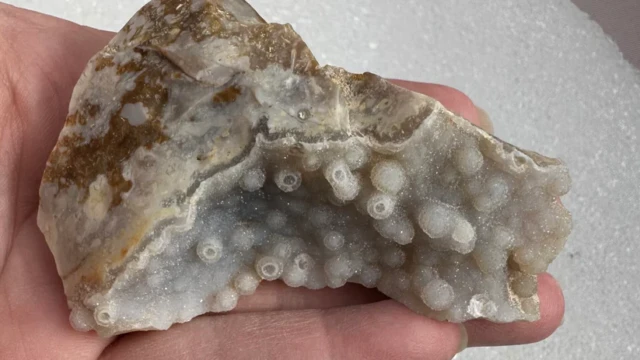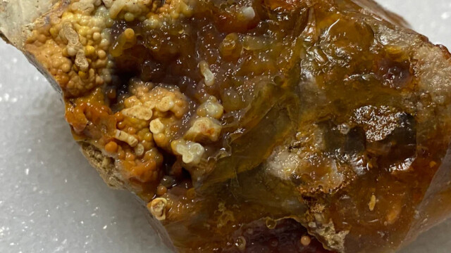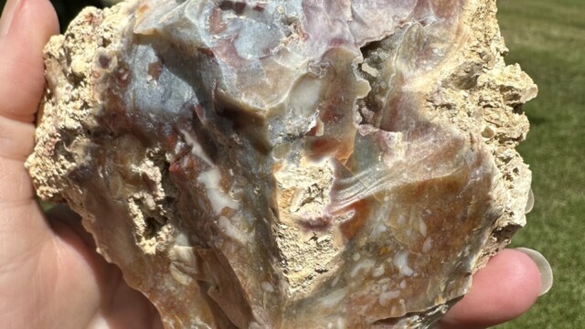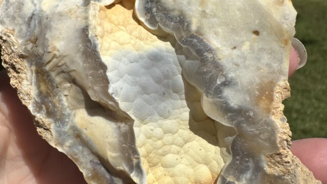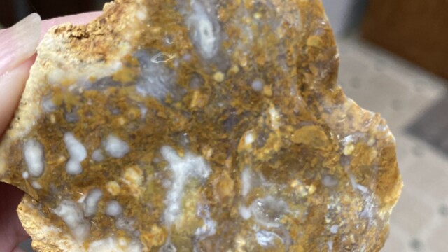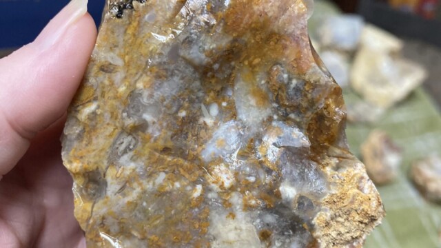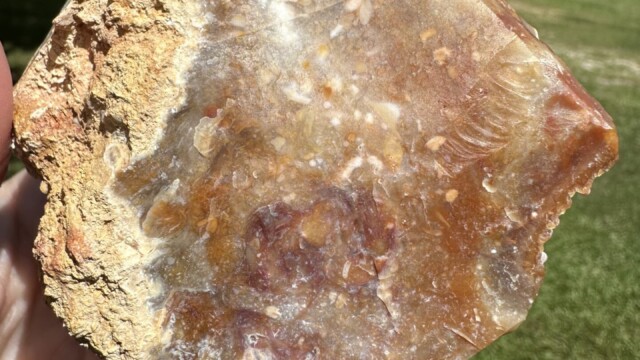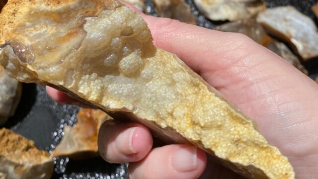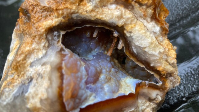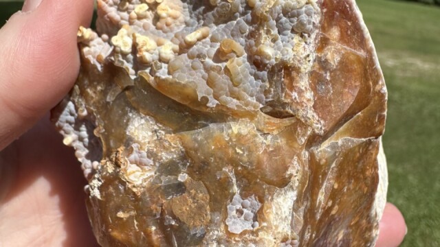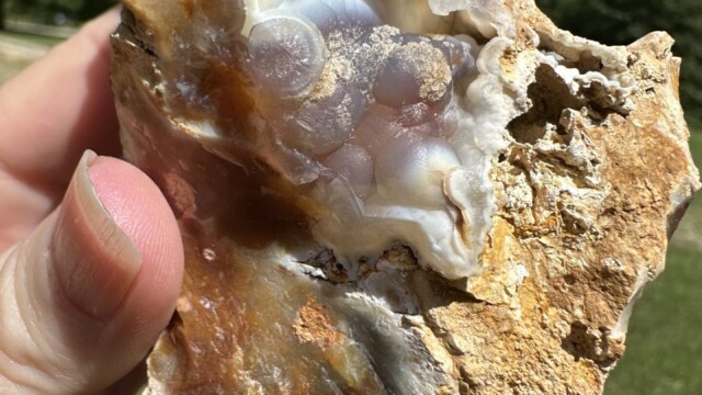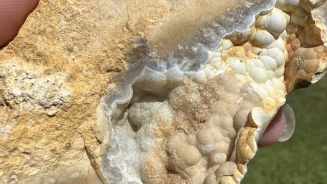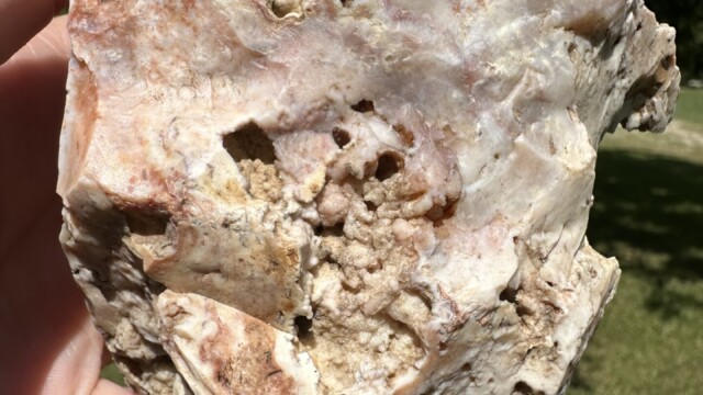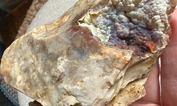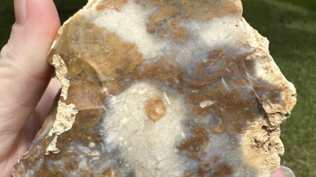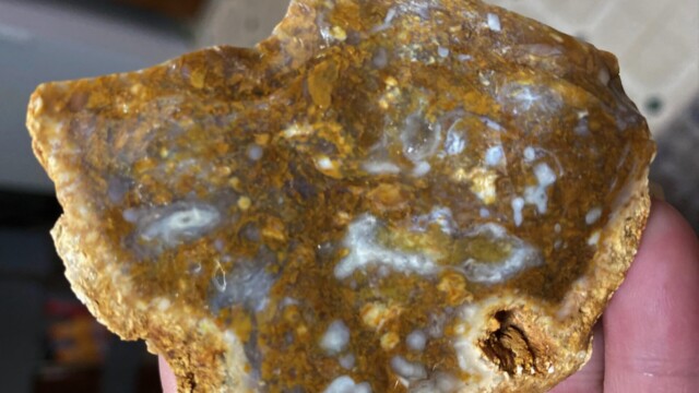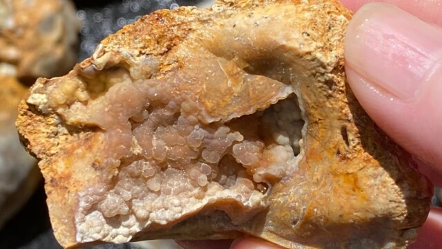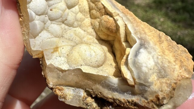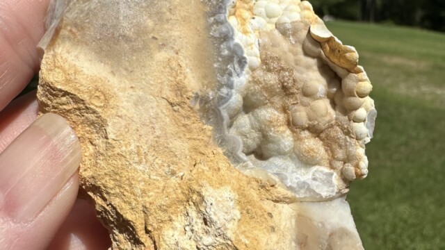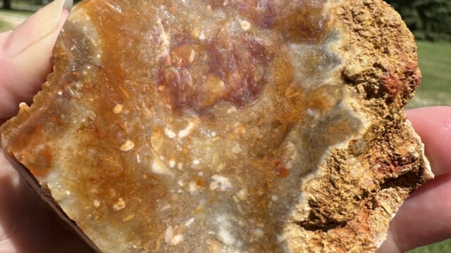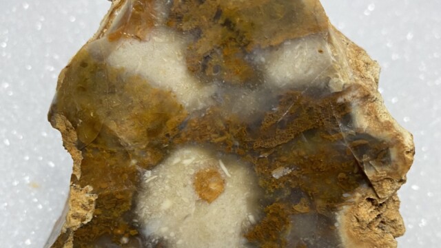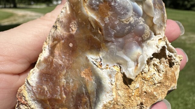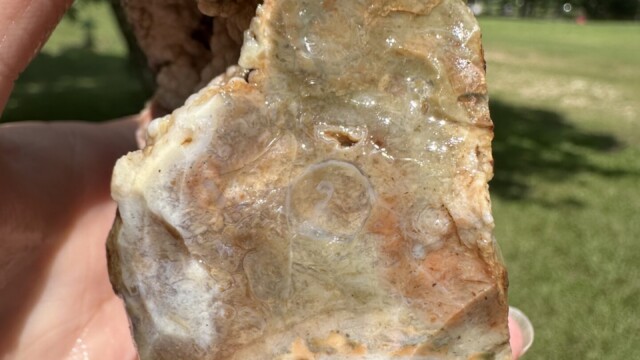 Savannah River Agate is a blend of minerals that formed in coral reefs, they are from 30-35 million year old Oligocene age deposits. You may find an assortments of treasures within, including fossils. The micro minerals are located in vugs of the agate/chert rock, Druzy Quartz, Gypsum, Hyalite Opal, Goethite, Limonite, Hematite, Green Wavellite, Strengite, Varascite, Cacoxenite, Kidwellite, Churchite, Rockbridgeite, Dufrenite, Jarosite. The fossils that can be found are Gastropods, Echinoids, Nummulites, Elems, Bryozoans, Barnacles, Diatoms and Tortilla.