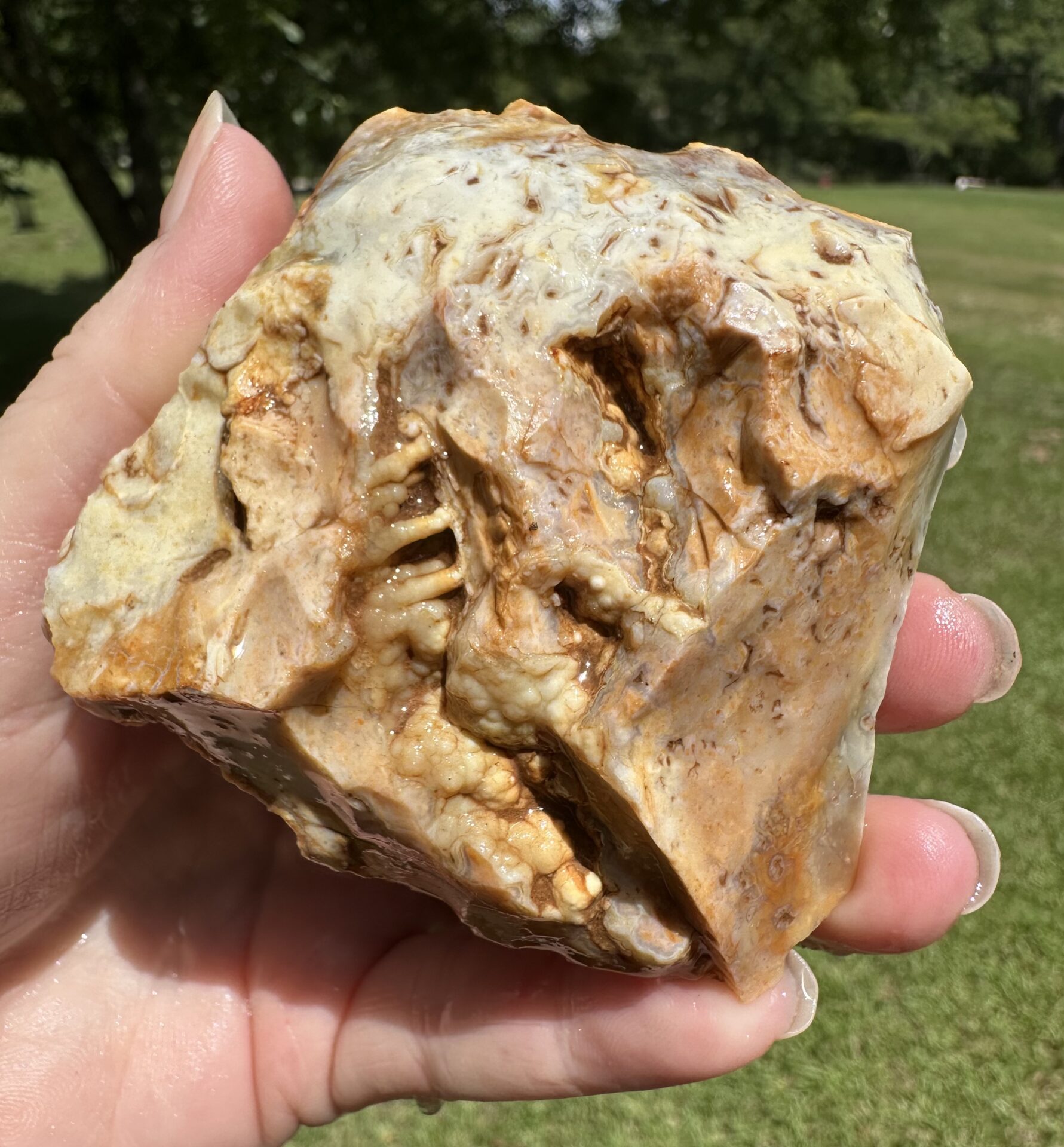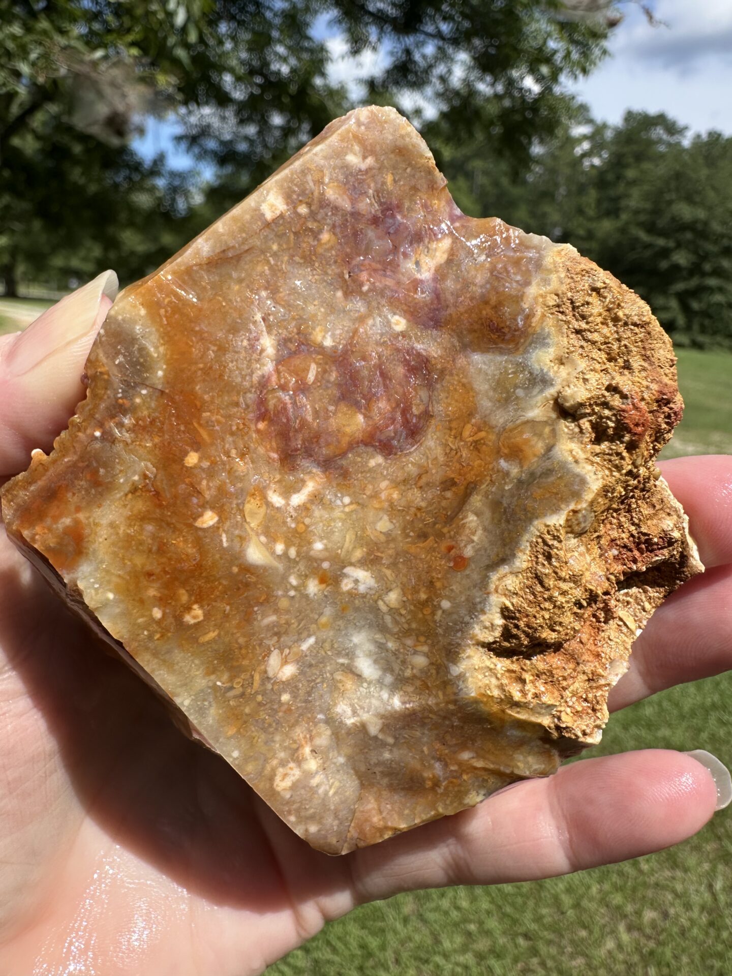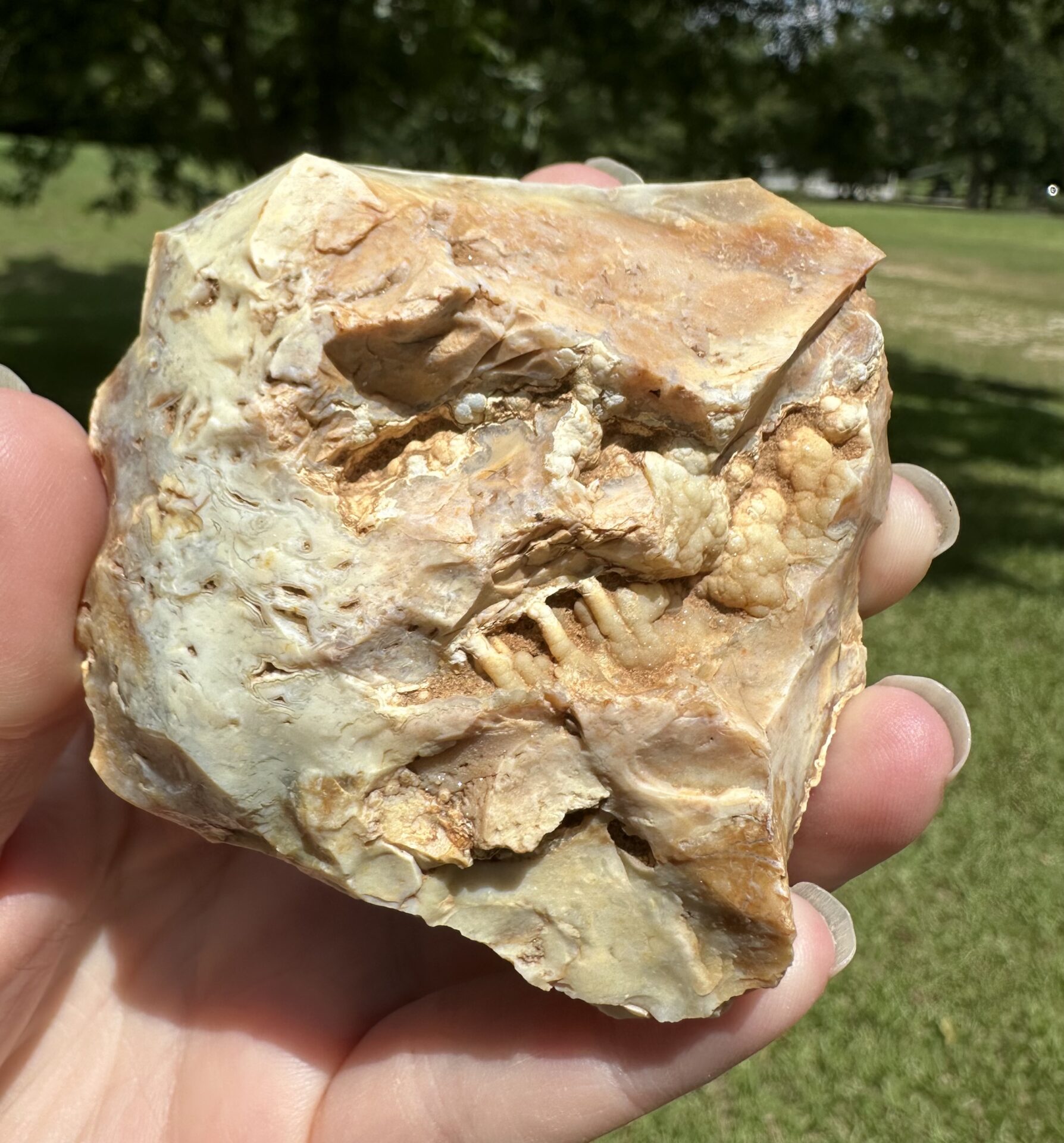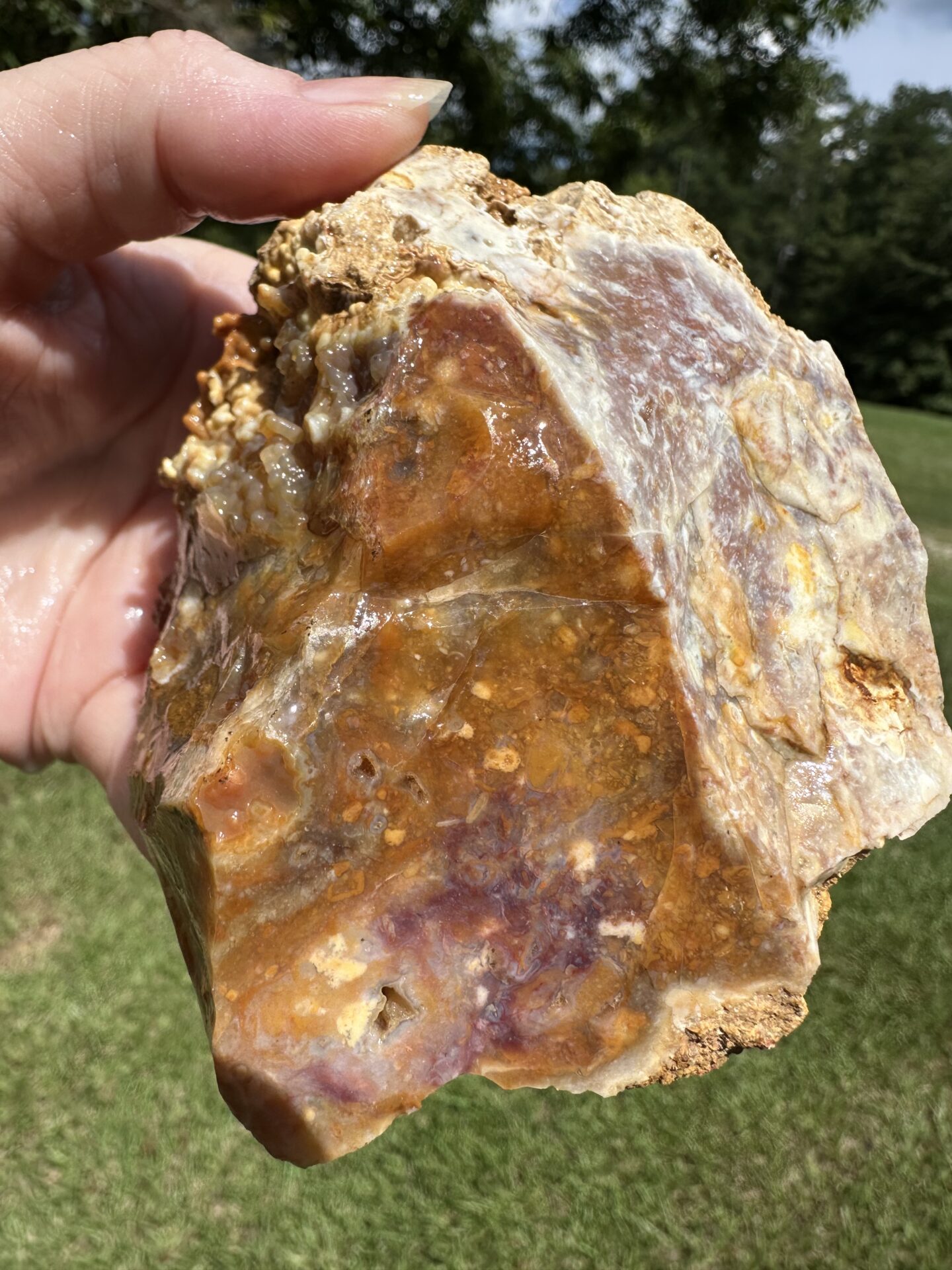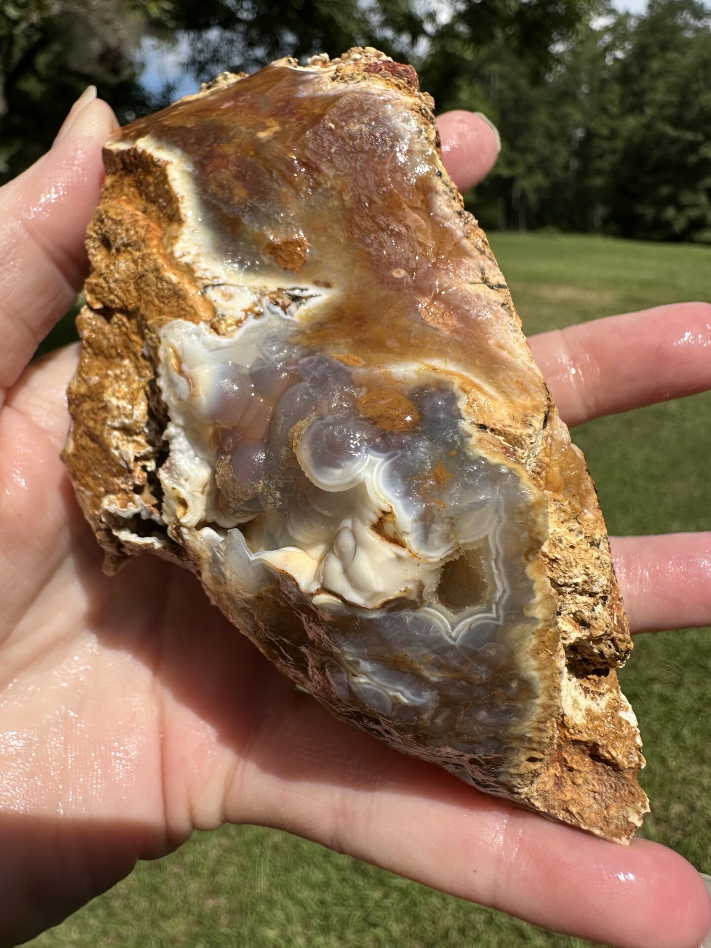 Savannah River Agate is a blend of minerals that formed in coral reefs, they are from 30-35 million year old Oligocene age deposits. You may find an assortments of treasures within, including fossils. The micro minerals are located in vugs of the agate/chert rock, Druzy Quartz, Gypsum, Hyalite Opal, Goethite, Limonite, Hematite, Green Wavellite, Strengite, Varascite, Cacoxenite, Kidwellite, Churchite, Rockbridgeite, Dufrenite, Jarosite. The fossils that can be found are Gastropods, Echinoids, Nummulites, Elems, Bryozoans, Barnacles, Diatoms and Tortilla.