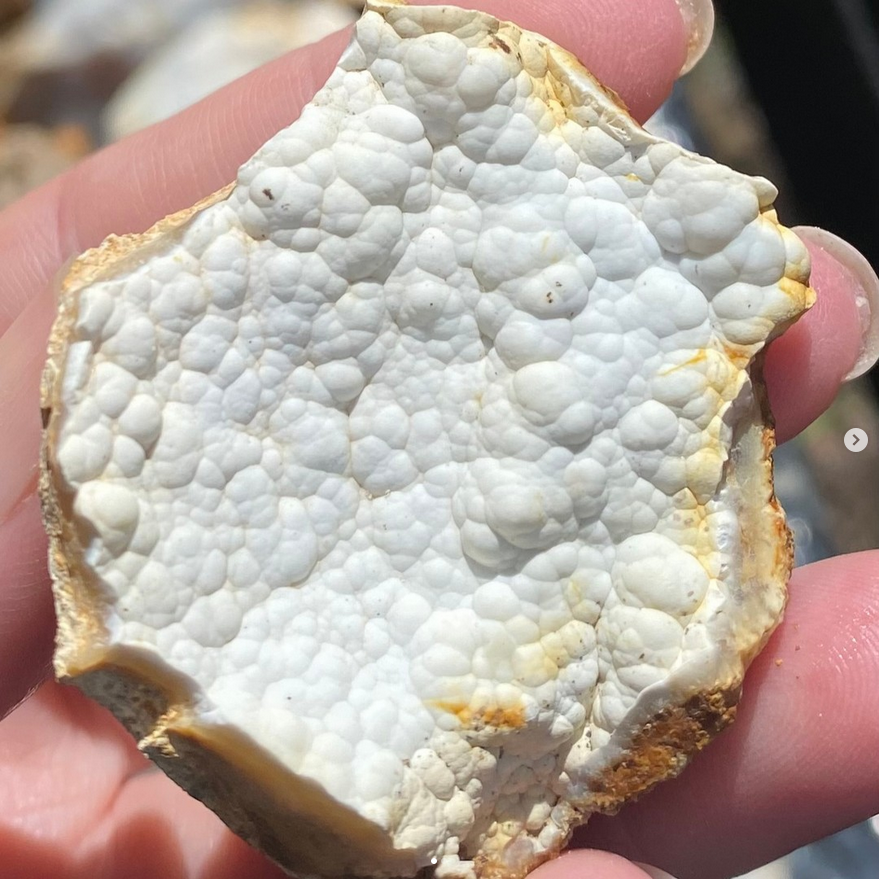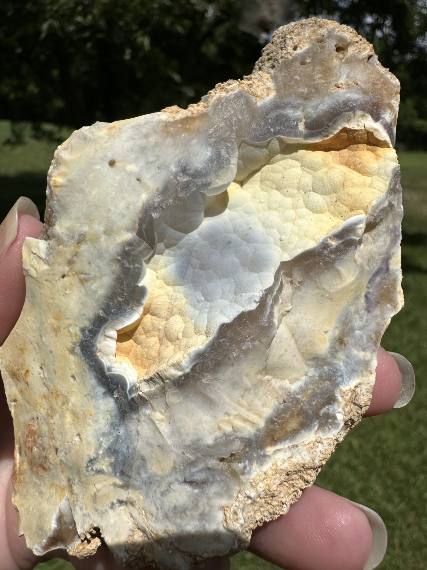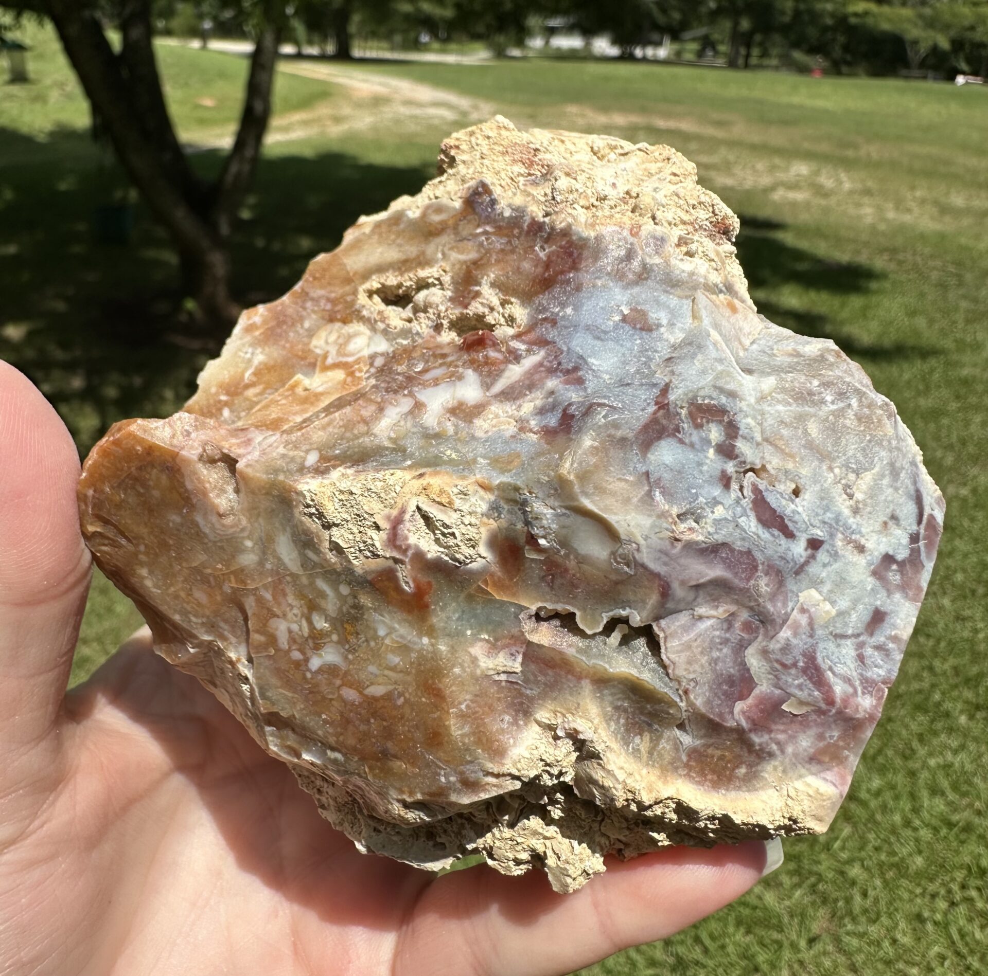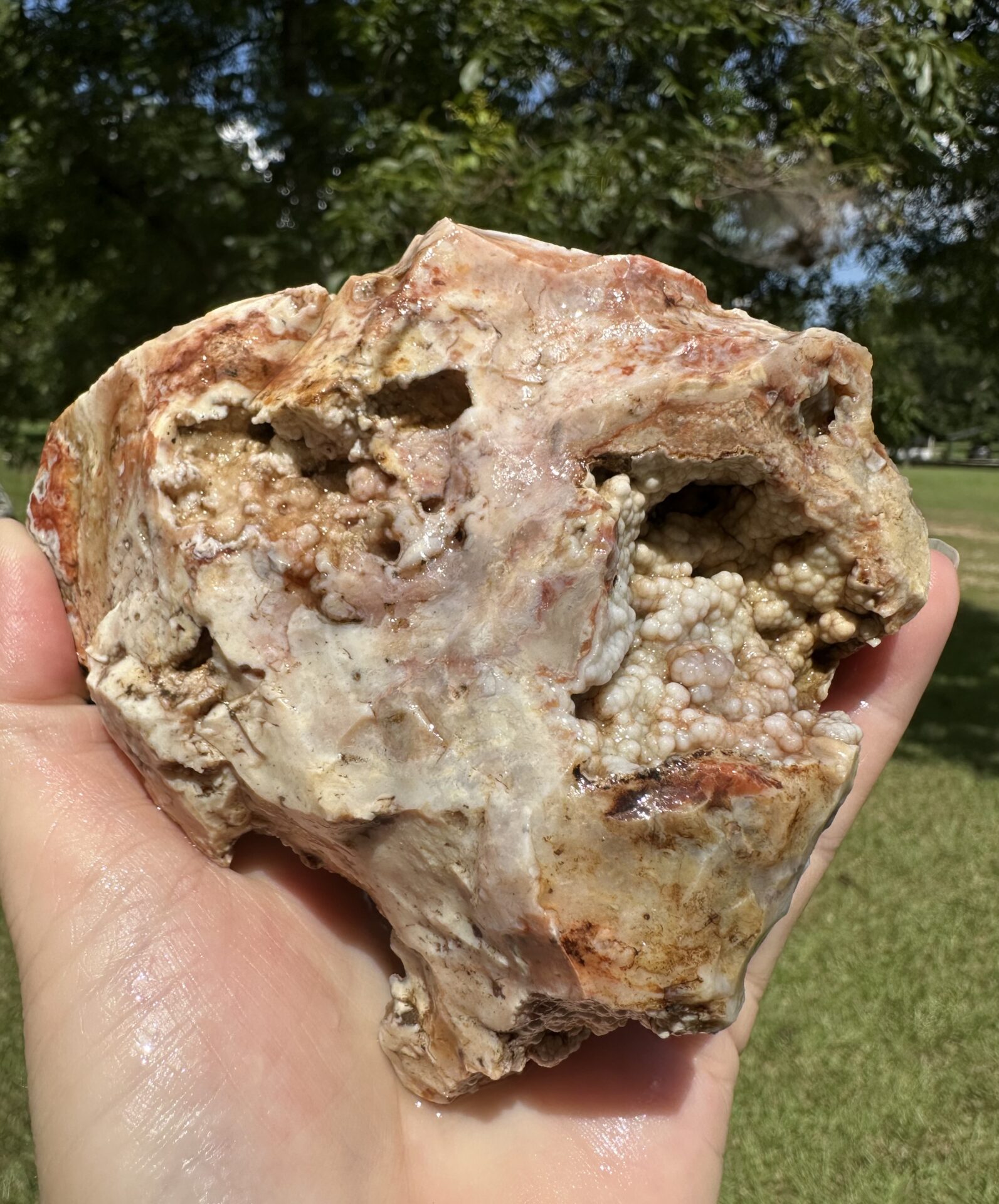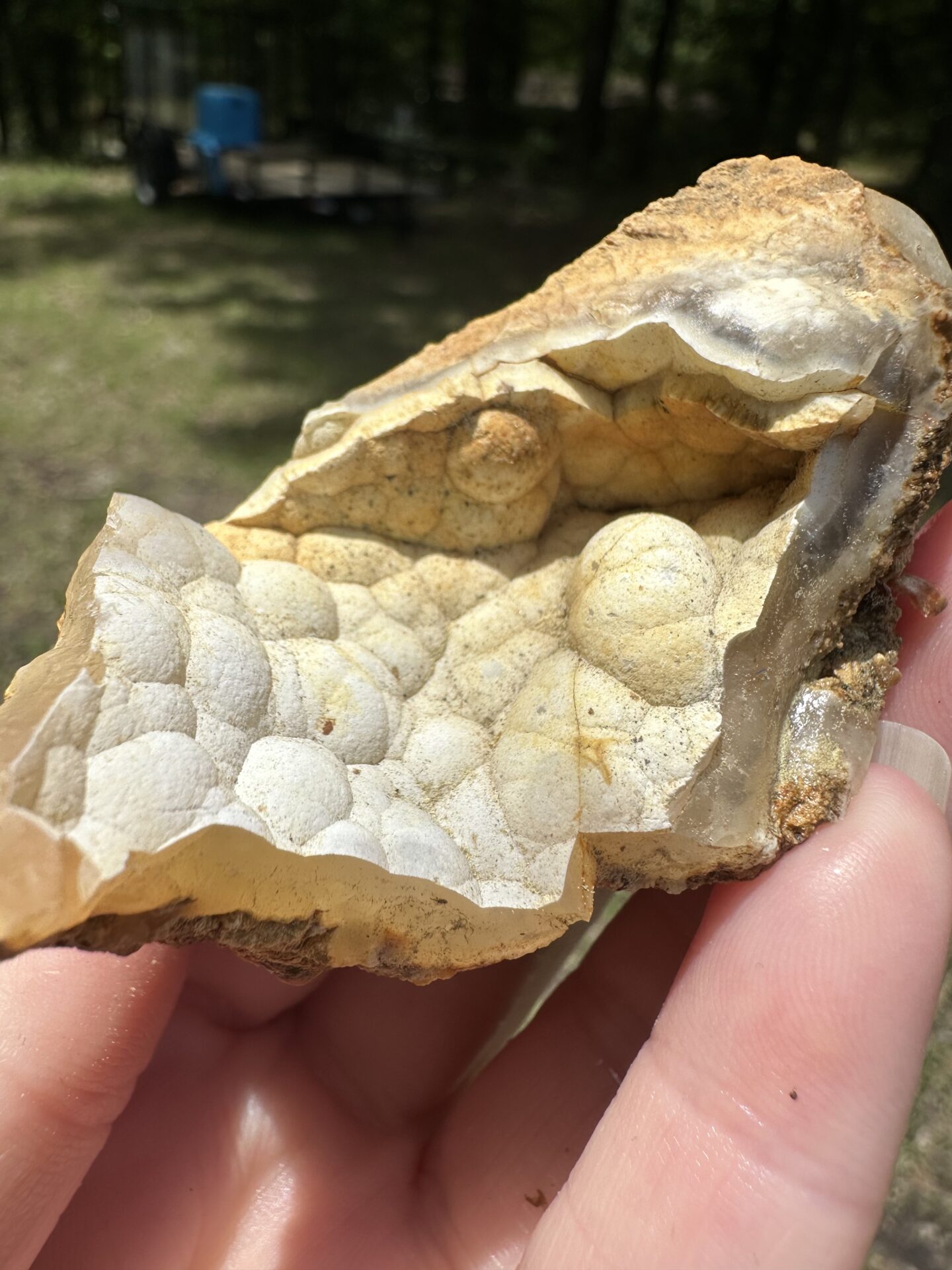 Savannah River Agate is a blend of minerals that formed in coral reefs, they are from 30-35 million year old Oligocene age deposits. You may find an assortments of treasures within, including fossils. The micro minerals are located in vugs of the agate/chert rock, Druzy Quartz, Gypsum, Hyalite Opal, Goethite, Limonite, Hematite, Green Wavellite, Strengite, Varascite, Cacoxenite, Kidwellite, Churchite, Rockbridgeite, Dufrenite, Jarosite. The fossils that can be found are Gastropods, Echinoids, Nummulites, Elems, Bryozoans, Barnacles, Diatoms and Tortilla.