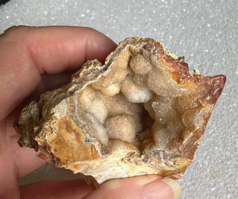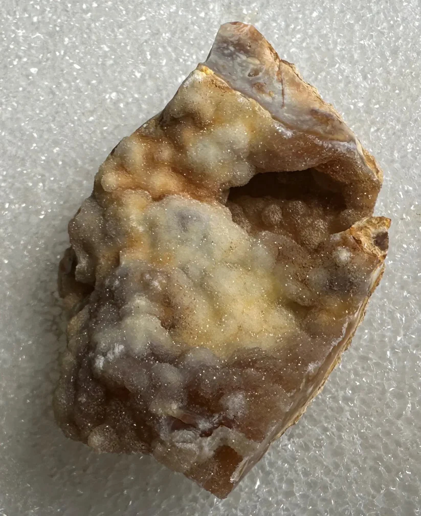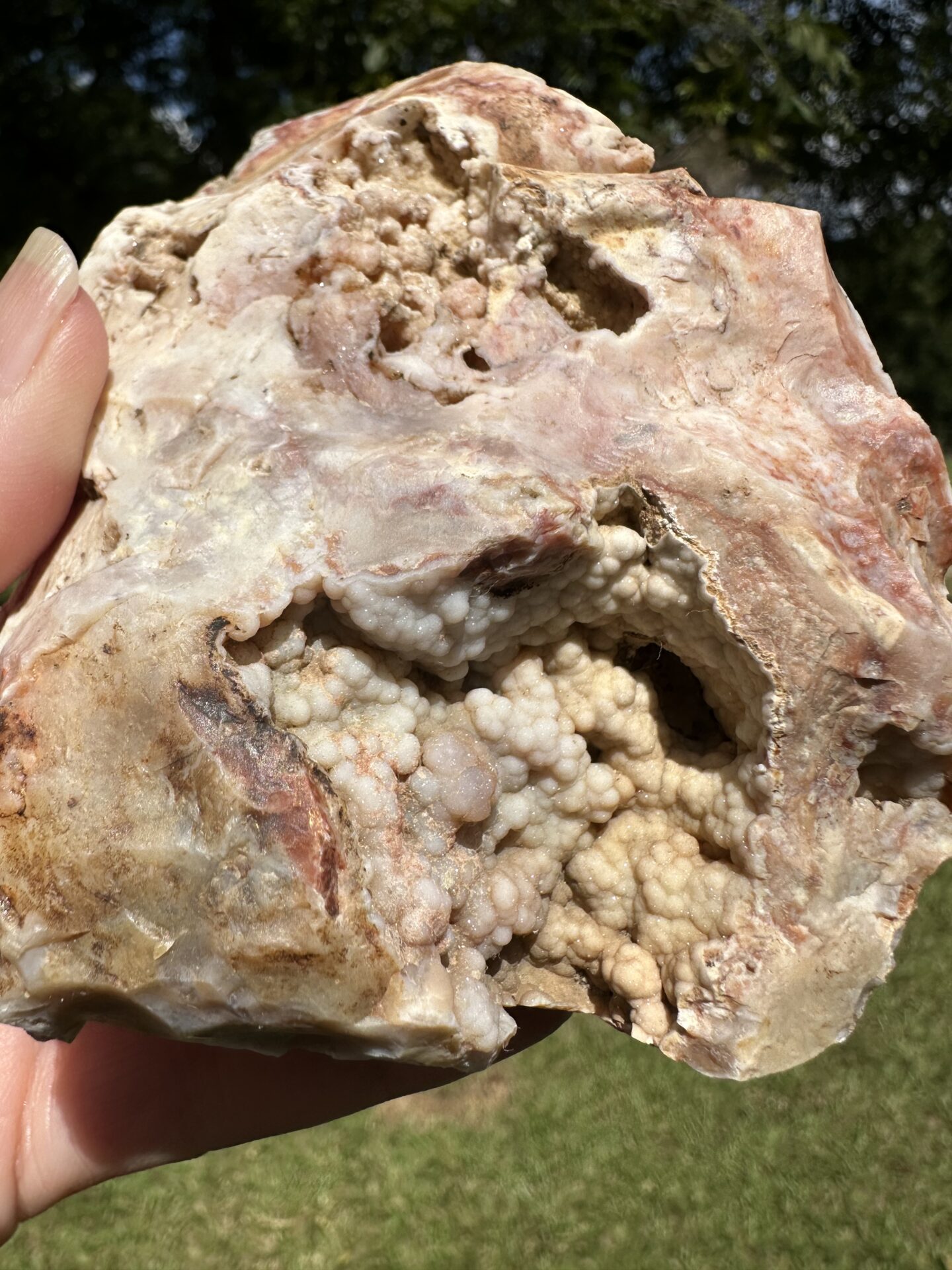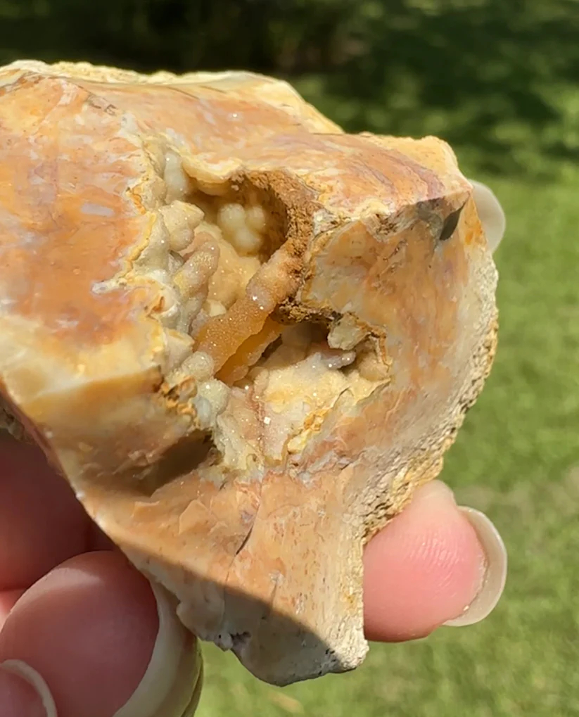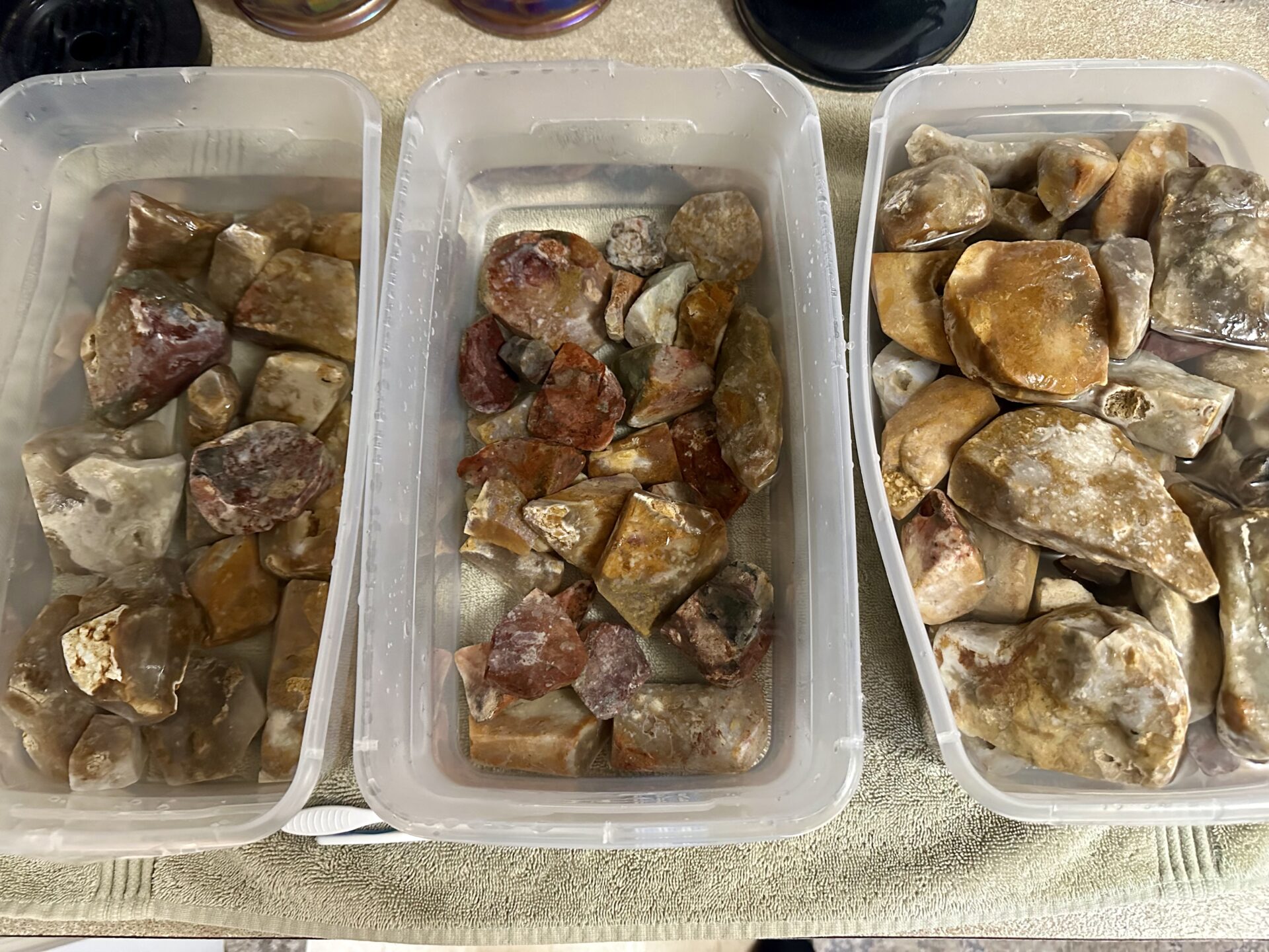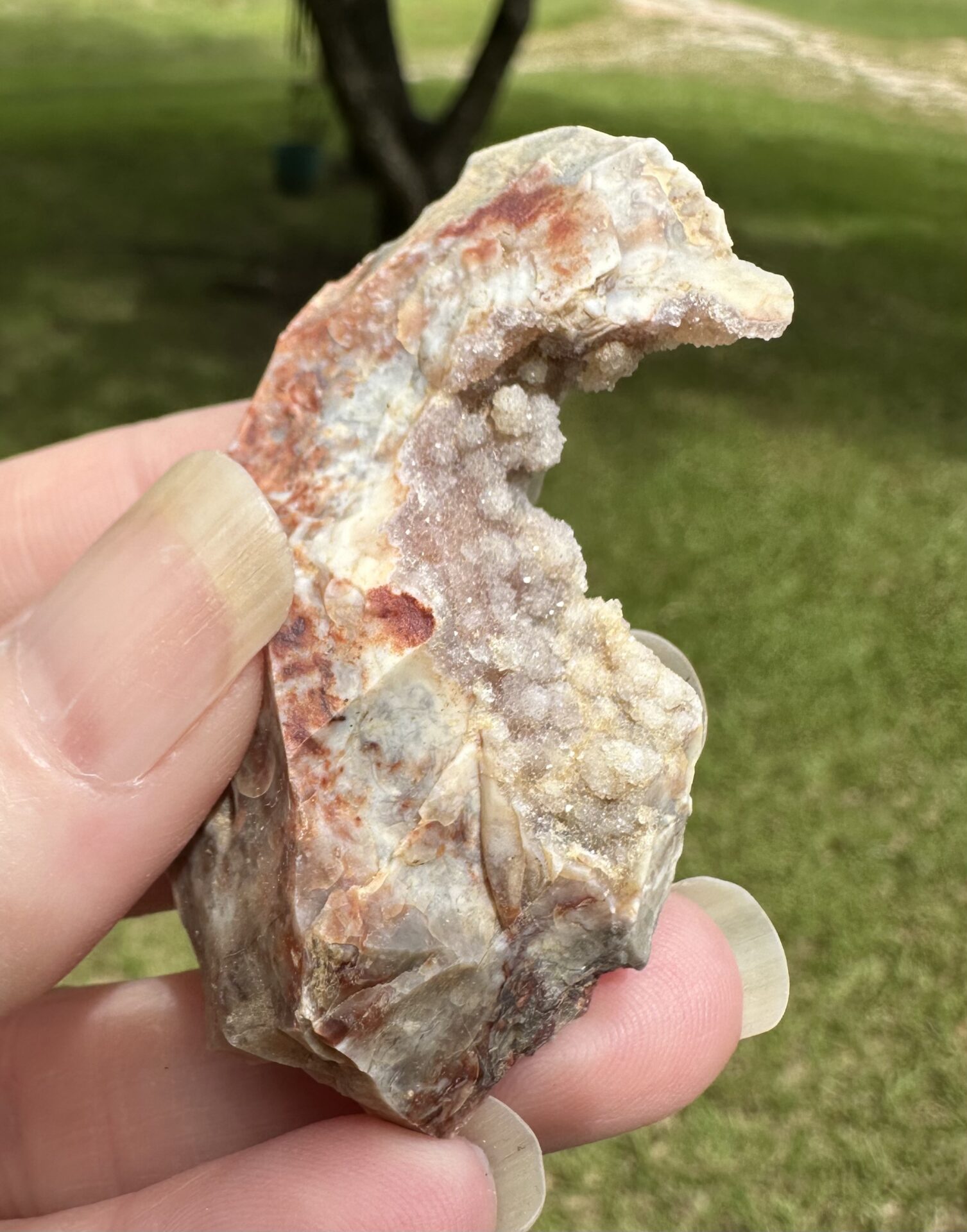 Savannah River Agate is a blend of minerals that formed in coral reefs, they are from 30-35 million year old Oligocene age deposits. You may find an assortments of treasures within, including fossils. The micro minerals are located in vugs of the agate/chert rock, Druzy Quartz, Gypsum, Hyalite Opal, Goethite, Limonite, Hematite, Green Wavellite, Strengite, Varascite, Cacoxenite, Kidwellite, Churchite, Rockbridgeite, Dufrenite, Jarosite. The fossils that can be found are Gastropods, Echinoids, Nummulites, Elems, Bryozoans, Barnacles, Diatoms and Tortilla.